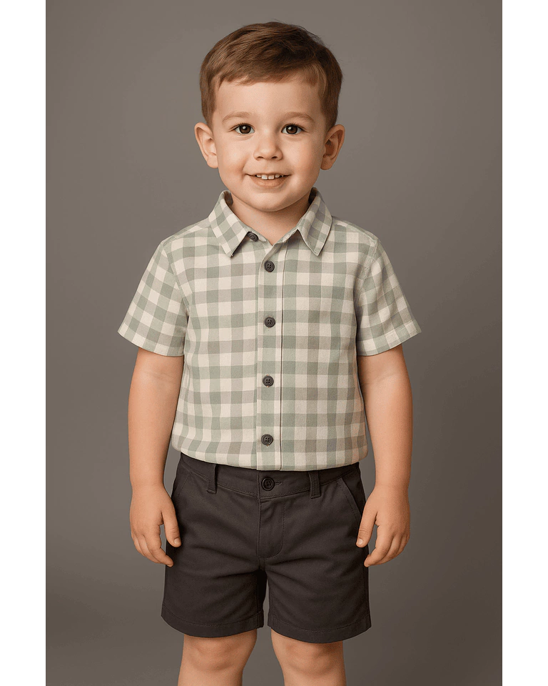 Ideal para acompanhar seus pequenos com muito charme e versatilidade. A camisa xadrez em tons de verde, com botões e modelagem clássica, é confeccionada em tecido misto de algodão e linho, proporcionando toque macio e delicado. Já a bermuda cinza chumbo possui bolsos funcionais e design moderno, e é produzida em alto teor de algodão e pequena porcentagem de elastano, garantindo conforto e liberdade de movimentos.