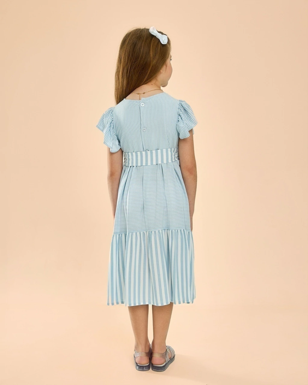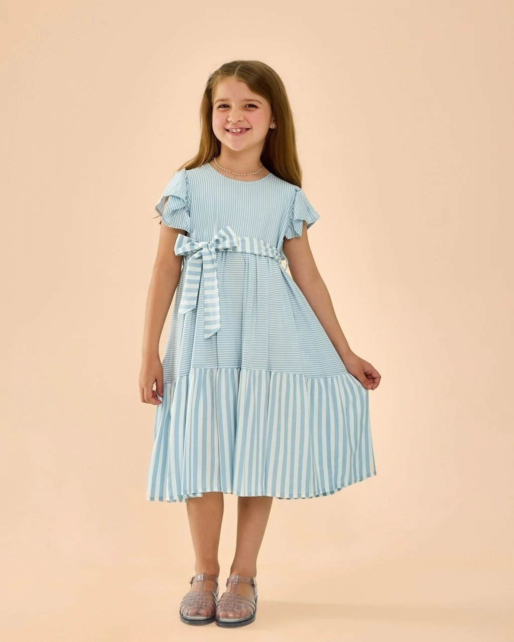 O vestido listrado com tom azul claro é uma opção leve e charmosa. Vem acompanhado por um cinto que possibilita a combinação de diferentes amarrações. Une conforto e modernidade em um visual versátil. Transmite suavidade, sendo perfeito para passeios, ocasiões especiais ou dia a dia.